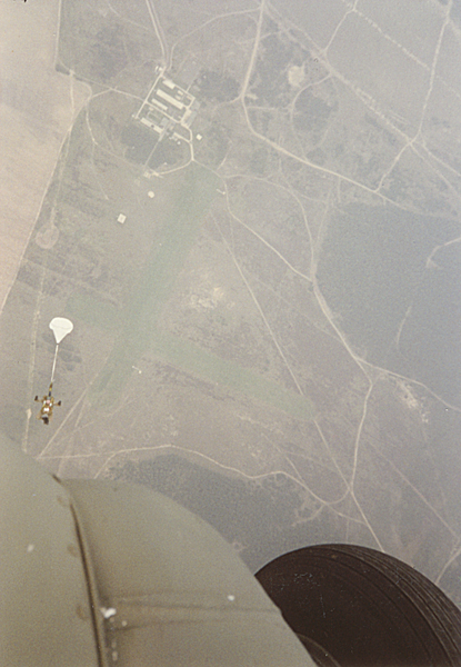"Unvorschriftsmäßig" blickt der Springer zur abfliegenden Absetzmaschine. Heißt es doch in einem Lehrfilm: "Schon während des freien Falls beobachten die Aufklärer das Gefechtsfeld":-))