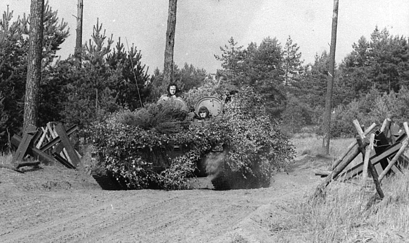 Gut getarnter MTLB des PiB-11 im Gelände.