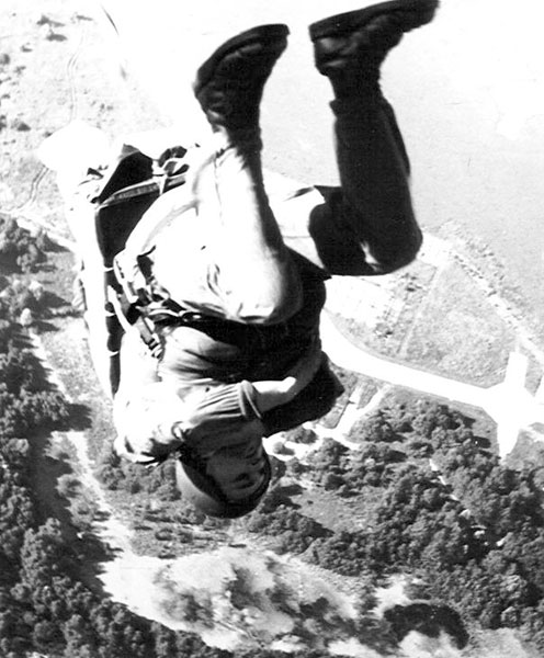 Der Augenblick unmittelbar nach dem Absprung aus der Maschine. Der Stabilisator hat den Springer noch nicht in eine aufrechte Lage gebracht.