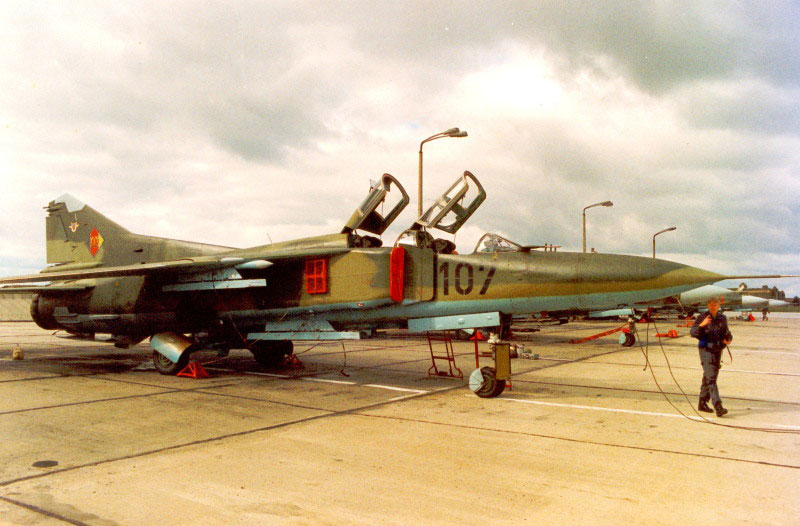 MiG-23UB während der fliegerischen Gefechtsausbildung an der Vorstartlinie, ein Pilot ist schon da - nun wartet er auf den Zweiten